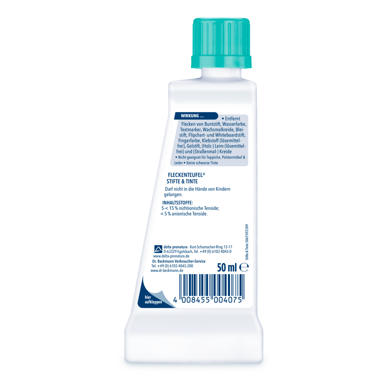 Спеціально розроблений засіб для видалення плям Dr. Beckmann Stain Devils Pen & Ink враховує особливості плям від кулькових ручок, інших ручок або акварелі. За допомогою спеціального розчинника кольорових частинок рідина для видалення плям розчиняє кольорові пігменти та видаляє їх з тканини.